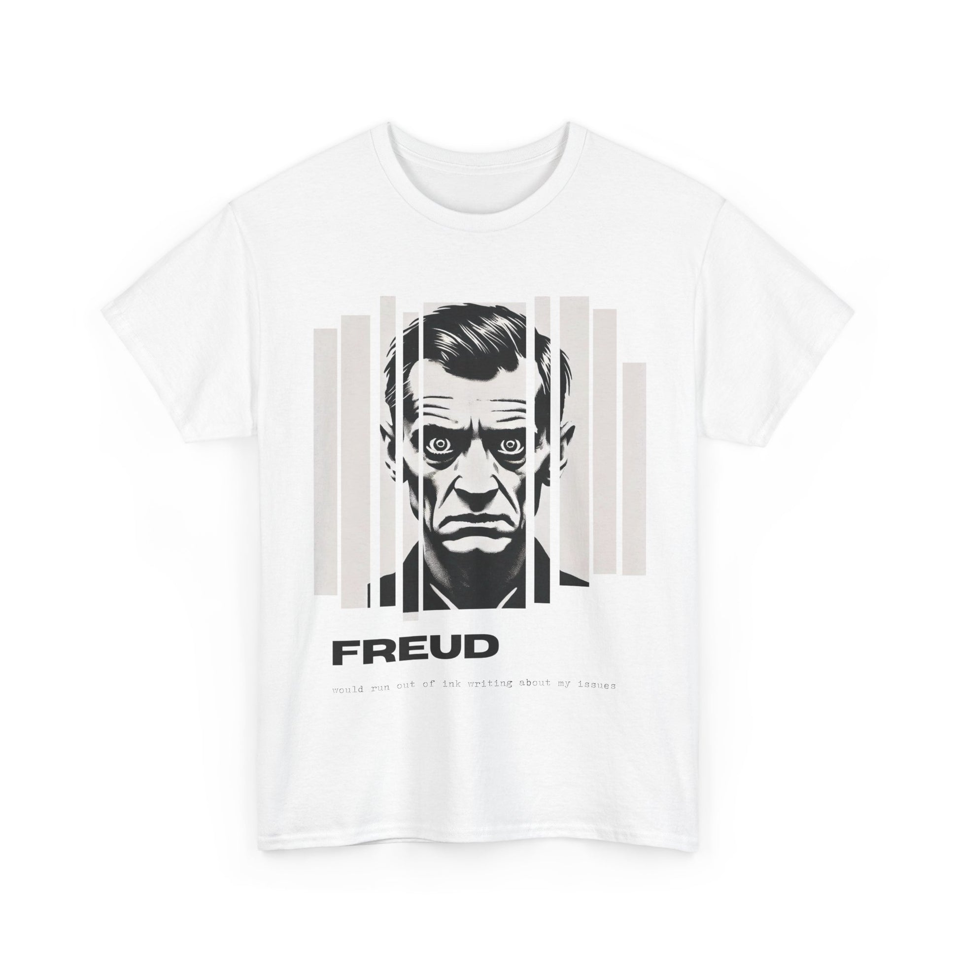 A bold, minimalist T-shirt for the deep thinkers and overthinkers. Featuring a stark black-and-white portrait inspired by Sigmund Freud’s intense gaze, this design captures the raw humor of self-awareness: “Freud would run out of ink writing about my issues.”