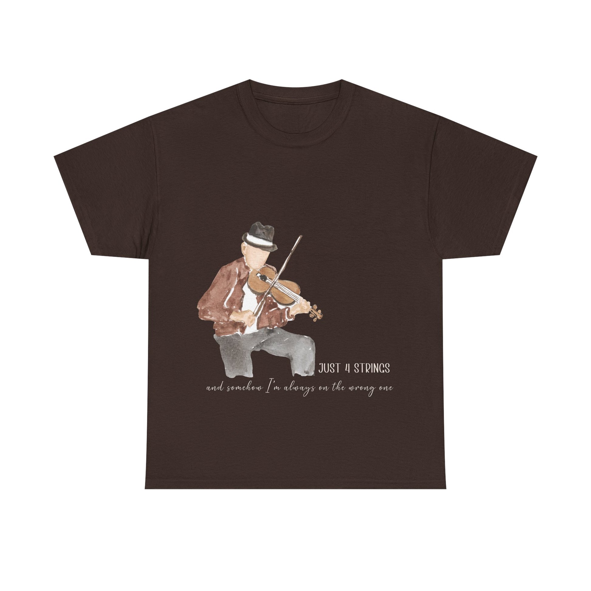 This witty unisex T-shirt features a watercolor-style violinist illustration with the quote: “Just 4 strings — and somehow I’m always on the wrong one.”